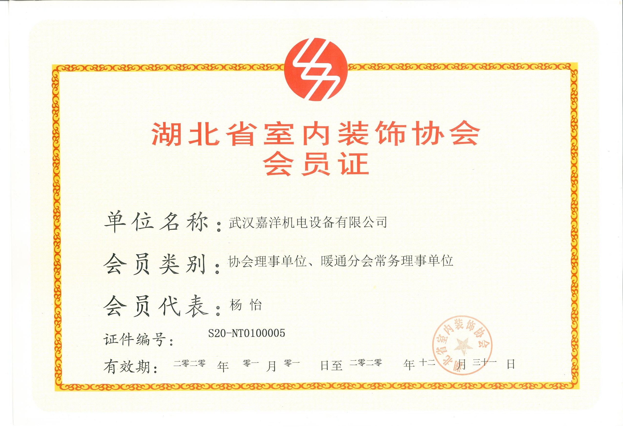 我公司獲2020年湖北省室內(nèi)裝飾協(xié)會(huì)會(huì)員證會(huì)員證,會(huì)員類別:協(xié)會(huì)理事單位、暖通分會(huì)常務(wù)理事單位,會(huì)員代表:楊怡。
