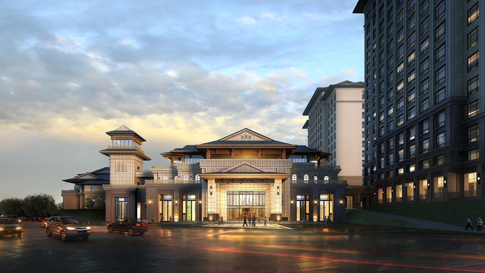 湖北省醫(yī)養(yǎng)康復(fù)中心建筑整體形態(tài)上,以中式民國風(fēng)為基調(diào)。建筑形體由南到北,形成逐漸升高之勢,沿湖建筑通過連廊、露臺深出檐的屋頂與湖景和諧統(tǒng)一。建筑空間最大化地結(jié)合庭院和湖景體現(xiàn)出居家之感,提升空間品質(zhì)。本設(shè)計充分貫徹了規(guī)劃方案設(shè)計中生態(tài)設(shè)計概念,基地四周利用地形高差種植大量階梯狀的綠化帶與綠化休閑廣場形成四面環(huán)繞的優(yōu)美景觀。
