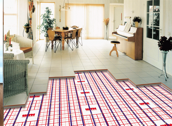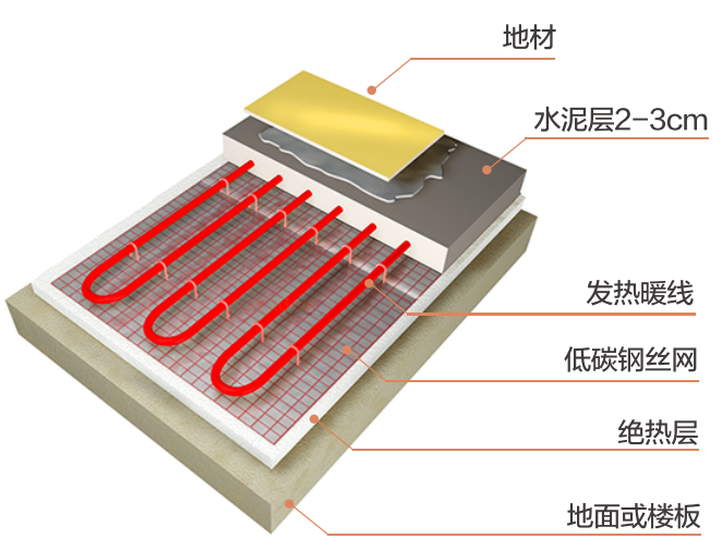 是以溫度不高于60℃的熱水埋置于地面以下填充層中的加熱管內(nèi)循環(huán)流動(dòng),