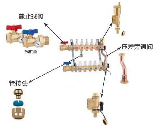 各水環(huán)路的分合部件,它具有對(duì)各供暖區(qū)域分配水流的作用,同時(shí)它還是金屬部件與