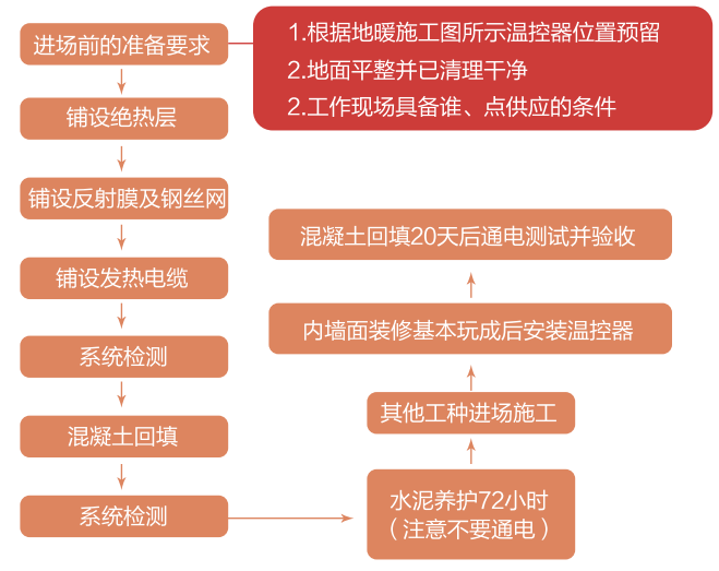 地暖進(jìn)場(chǎng)前的要求(裝潢公司的冷熱水、強(qiáng)弱電必須完全結(jié)束并通過業(yè)主的驗(yàn)收,衛(wèi)生間防水要刷好,地面平整度需要按要求做好,線管如何走等);在現(xiàn)場(chǎng)大家可一起溝通一下施工的進(jìn)度,地暖的進(jìn)度是按照裝潢的節(jié)點(diǎn)來的,裝潢做好一步,地暖才可以跟進(jìn)一步,是無法確定具體時(shí)間的,基本上是裝潢的一步做好了,再提前幾天通知暖通公司做下一步,但是交底時(shí)暖通公司需要把各個(gè)