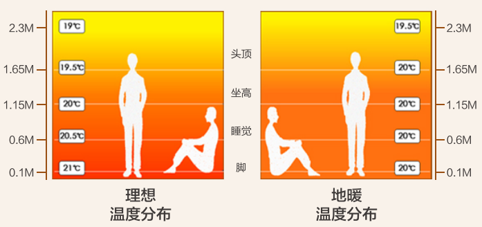 熱從地板通過輻射散熱到熱體活動(dòng)區(qū),最接近人體的溫度需求