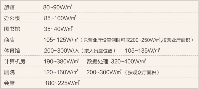 根據(jù)國內(nèi)現(xiàn)有的一些工程冷負(fù)荷指標(biāo)套用(下列指標(biāo)為按總建筑面積的冷負(fù)荷指標(biāo)):